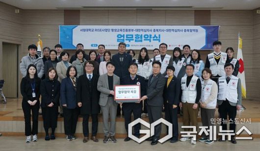 (청주=국제뉴스) 이재기 기자 = 서원대학교(총장 손석민) RISE사업단 평생교육진흥본부는 14일 대한적십자사 충북지사, 대한적십자사 충북혈액원과 신중년 사회공헌 프로그램 추진을 위한 업무협약을 체결했다고 밝혔다.