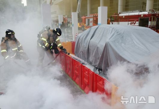 [서울=뉴시스] 배훈식 기자 = 2025 강남구 안전한국훈련 긴급구조 종합훈련이 진행된 20일 오후 서울 강남구 코엑스에서 소방대원들이 전기차 화재진압 훈련을 하고 있다. 2025.10.20. dahora83@newsis.com |