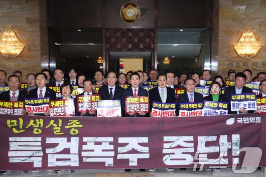(서울=뉴스1) 신웅수 기자 = 장동혁 대표를 비롯한 국민의힘 의원들이 15일 서울 여의도 국회 로텐더홀에서 더불어민주당의 특검 추진에 반대하며 구호를 외치고 있다. 2026.1.15/뉴스1phonalist@news1.krCopyright ⓒ 뉴스1. All rights reserved. 무단 전재 및 재배포, AI학습 이용 금지.