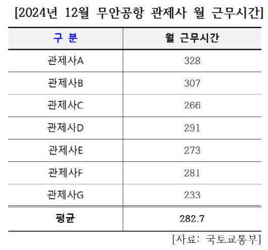 특히 참사가 발생한 2024년 12월에는 무안공항 관제사의 최대 근무시간이 328시간, 평균 근무시간은 282.7시간에 달했다. 이는 일반 근로자의 월 평균 근무시간(약 160~170시간)의 두 배에 가까운 수준이다.