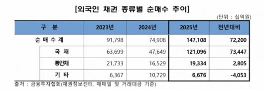 반면 외국인의 채권 순매수는 전년 대비 72조7000억원 증가한 147조1000억원이었다. 지난해 말 기준 외국인의 국내 채권보유 잔고는 338조3000억원으로 2024년 말 대비 70조1000억원 늘었다. 금투협은 "금리 및 환율 변동성 확대에 따른 재정거래 유인 확대와 WGBI 편입 기대감 등 영향이다"고 했다.
