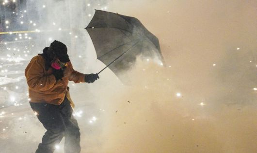 14일 발생한 미국 미니애폴리스 총격 사건 현장에 최루가스가 자욱한 가운데 법집행 요원들이 서 있다. 미니애폴리스/AP연합뉴스 |