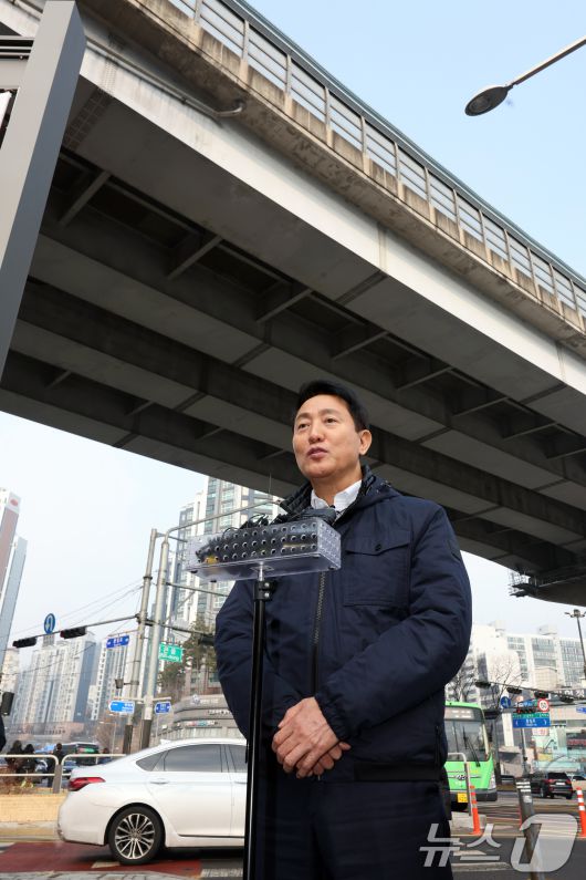 (서울=뉴스1) 황기선 기자 = 오세훈 서울시장이 15일 오후 서울 서대문구 홍은사거리에서 홍제천 일대 내부순환로 현장을 둘러본 뒤 소감을 밝히고 있다. 오 시장은 지난해 12월 18일 기자간담회에서 내부순환로와 북부간선도로를 지하화하는 '강북횡단 지하도시고속도로 건설사업'을 추진한다고 밝힌 바 있다. 2026.1.15/뉴스1