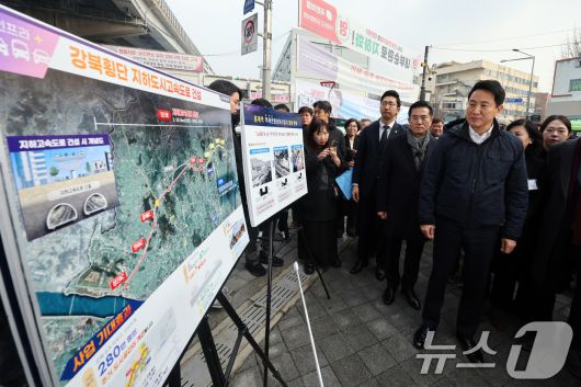(서울=뉴스1) 황기선 기자 = 오세훈 서울시장이 15일 오후 서울 서대문구 홍은사거리에서 홍제천 일대 내부순환로 현장을 둘러본 후 관계자에게 브리핑을 받고 있다. 오 시장은 지난해 12월 18일 기자간담회에서 내부순환로와 북부간선도로를 지하화하는 '강북횡단 지하도시고속도로 건설사업'을 추진한다고 밝힌 바 있다. 2026.1.15/뉴스1