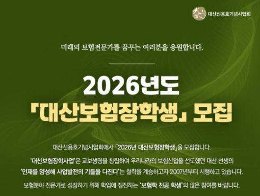 대산신용호기념사업회가 국내 보험학 분야의 우수 인재를 발굴·육성하기 위해 다음달 6일까지 '2026년 대산보험장학생'을 모집한다. [사진=대산신용호기념사업회] |