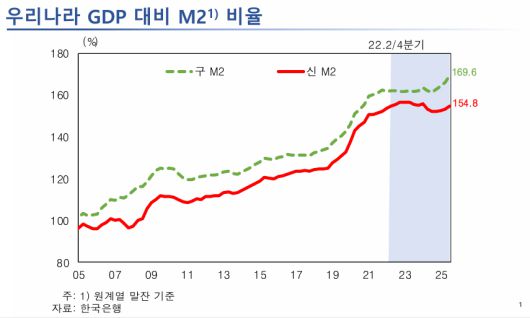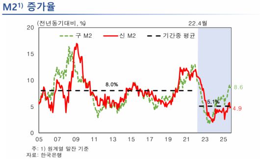 한은이 공개한 자료에서도 M2 증가율은 코로나19 팬데믹 국면을 지나 2022년 이후 낮아진 흐름이 제시됐다. M2 증가율 그래프에는 최근 수치(예: 4.9)와 함께 '기간중 평균'(구 8.0%·신 5.1%)이 표시돼, 최근 통화 증가세가 과거 평균에 비해 낮은 수준이라는 설명의 근거로 활용됐다.