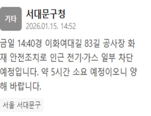 서대문구청은 15일 오후 2시 52분께 "금일 오후 2시 40분경 이화여대길 83길 공사장 화잴 안전조치로 인근 전기·가스 일부 차단 예정"이라는 내용이 담긴 재난문자를 발송했다.