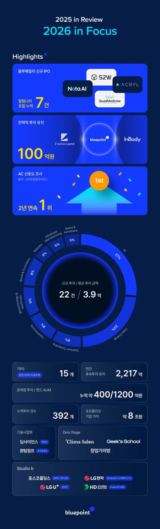 재무적 기반 역시 확대됐다. 블루포인트는 누적 본계정 투자 약 400억원을 집행했으며, 펀드 총운용자산(AUM)은 약 1200억원 규모로 성장했다. 특히 지난해 말 제트벤처캐피탈(ZVC)과 인바디로부터 100억원 규모의 전략적 투자를 유치하며 초기 딥테크 투자 역량을 한층 강화했다. 블루포인트는 이들 전략적 투자자와 글로벌 진출 및 신사업 분야에서 본격적인 협력에 나설 계획이다.