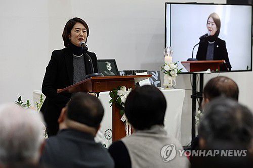 (서울=연합뉴스) 윤동진 기자 = 더불어민주당 고민정 의원이 15일 서울 구로구 성공회대학교에서 열린 고 신영복 선생 10주기 추모식에서 문재인 전 대통령의 추모사를 대독하고 있다. 2026.1.15