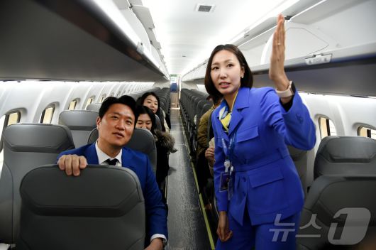 (서울=뉴스1) = 15일 서울 김포 비즈니스 항공센터에서 진행된 섬에어 1호기 도입식에서 최용덕 섬에어 대표가 공개한 1호 신조기 내부에서 객실 승무원의 안내를 받고 있다. (섬에어 제공. 재판매 및 DB 금지) 2026.1.15/뉴스1urodoct2@news1.krCopyright ⓒ 뉴스1. All rights reserved. 무단 전재 및 재배포, AI학습 이용 금지.