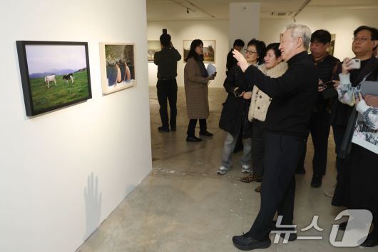(서울=뉴스1) 이광호 기자 = 박용만 전 두산회장이 15일 오후 서울 중구 피크닉 전시관에서 열린 자신의 사진전 '휴먼 모먼트' 기자간담회에 앞서 참석자들에게 전시 작품에 대해 설명하고 있다. 2026.1.15/뉴스1