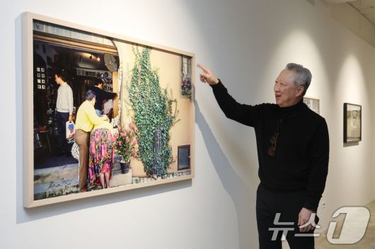 (서울=뉴스1) 이광호 기자 = 박용만 전 두산회장이 15일 오후 서울 중구 피크닉 전시관에서 열린 자신의 사진전 '휴먼 모먼트' 기자간담회에 앞서 참석자들에게 전시 작품에 대해 설명하고 있다. 2026.1.15/뉴스1