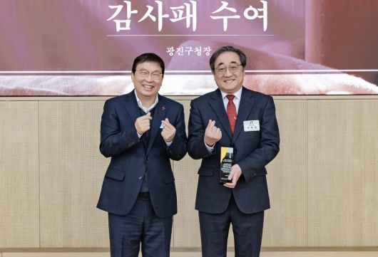 김경호 광진구청장과 남성이 감사패를 들고 손가락 하트 포즈를 취하고 있는 사진이다. 상단에는 감사패 수여, 광진구청장이라는 텍스트가 적혀 있다. |