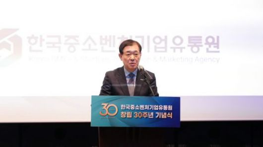 이태식 한국중소벤처기업유통원 대표가 15일 서울 양천구 본사에서 열린 창립 30주년 기념식에서 발언하고 있다. 한국중소벤처기업유통원 |