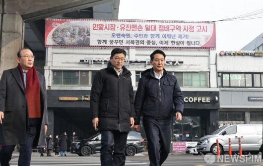 [서울=뉴스핌] 양윤모 기자 = 오세훈 서울시장이 15일 오후 서대문구 홍제동 유진상가에서 개최된 '강북횡단 지하고속도로' 현장을 찾아 라운딩을 하고 있다. 2026.01.15 yym58@newspim.com