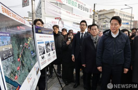 [서울=뉴스핌] 양윤모 기자 = 오세훈 서울시장이 15일 오후 서대문구 홍제동 유진상가에서 개최된 '강북횡단 지하고속도로' 현장을 찾아 사업설명을 청취하고 있다. 2026.01.15 yym58@newspim.com