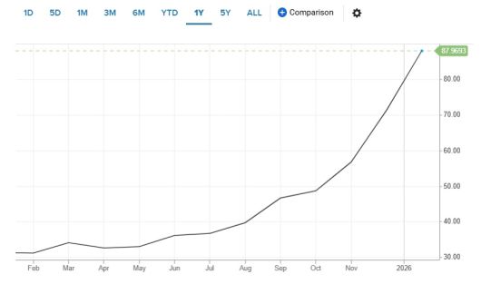 지난해 현물 금은 가격이 약 65% 급등하며 수차례 가격 기록을 경신했다. 은의 상승폭은 금의 2배 이상이었다. 같은 기간 은은 약 150% 폭등했다.