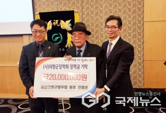 (의령=국제뉴스) 황재윤 기자 = 의령군은 15일, 지난 9일 서울 강남구 삼정호텔에서 열린 '2026년 재경의령군향우회 신년하례회'에서 재경의령군향우회 원로 전병준 씨가 의령군장학회에 장학금 2,000만 원을 기탁했다고 밝혔다.