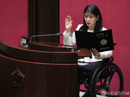[서울=뉴스핌] 윤창빈 기자 = 이소희 국민의힘 의원이 15일 서울 여의도 국회에서 열린 본회의에서 국회의원 선서를 하고 있다. 이소희 의원은 인요한 전 의원이 사퇴를 함에 따라 의원직을 승계 받았다. 2026.01.15 pangbin@newspim.com