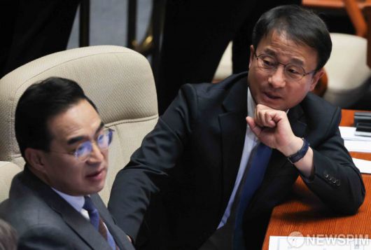 [서울=뉴스핌] 윤창빈 기자 = 한병도 더불어민주당 원내대표, 박홍근 의원이 15일 서울 여의도 국회에서 열린 본회의에서 대화를 하고 있다. 2026.01.15 pangbin@newspim.com