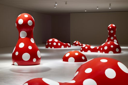 미술관 소장품인 ‘새로운 세계를 향한 이정표’는 빨간 물방울 형태의 여러 조각이 모여 하나의 구조를 이루는 대형 설치 작품이다. 쿠사마의 트레이드마크로 알려진 점 무늬가 적용된 이 작품은 붉은 색채와 하얀 패턴의 대비가 특징이며, 표면은 반짝이는 질감으로 마감돼 시각적 인상을 더욱 강조한다. 곡선미가 돋보이는 조각들은 개별적인 형태를 유지하면서도 서로 유기적으로 연결돼, 하나의 흐름과 방향성을 형성한다.
