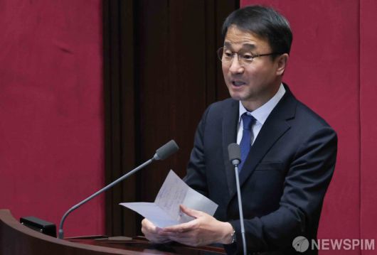 [서울=뉴스핌] 윤창빈 기자 = 국회 운영위원장으로 선출된 한병도 더불어민주당 의원이 15일 서울 여의도 국회에서 열린 본회의에서 당선 인사말을 하고 있다. 2026.01.15 pangbin@newspim.com
