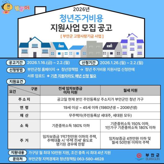 군 관계자는 "고향을 응원하는 마음이 담긴 기부금이 부안의 미래인 청년들에게 실질적인 도움이 되고 있다"며 "주거 부담 완화를 통해 청년들이 안정적으로 지역에 정착할 수 있도록 지속적으로 지원하겠다"고 말했다.