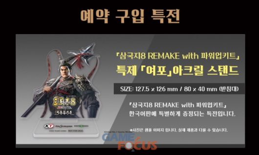PlayStation®5/Nintendo Switch판의 예약 구입 특전으로는 『삼국지8 REMAKE with 파워업키트』 한글판에만 제공되는 특제 「여포」 아크릴 스탠드가 제공된다.