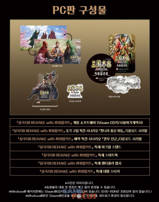 『삼국지8 REMAKE with 파워업키트』or『삼국지8 REMAKE 파워업키트』 Steam® CD Key/사용허가계약서 『삼국지8 REMAKE with 파워업키트』 예약 구입 특전 시나리오「관우 진군」다운로드 시리얼 『삼국지8 REMAKE with 파워업키트』 조기 구입 특전 시나리오 「한나라 충신 마등」 다운로드 시리얼 『삼국지8 REMAKE with 파워업키트』 특제 아크릴 스탠드 『삼국지8 REMAKE with 파워업키트』 특제 스마트톡 『삼국지8 REMAKE with 파워업키트』 특제 렌티큘러 엽서 『삼국지8 REMAKE with 파워업키트』 특제 대형 스티커