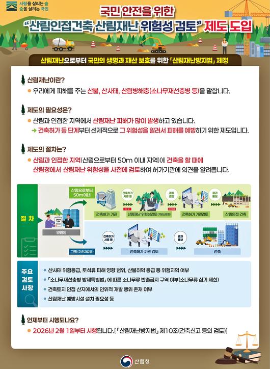 산림청은 해당 제도가 정착되면 건축설계 단계에서부터 산림재난 위험성이 고려돼 예방시설을 마련할 수 있고 산림재난에 선제적으로 대비해 국민의 생명과 신체를 보호하는 데 크게 기여할 것으로 기대하고 있습니다.