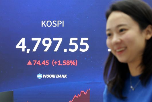 코스피가 연일 사상 최고치를 경신한 15일 서울 중구 우리은행 본점 딜링룸 현황판에 종가가 표시되고 있다. 이날 코스피는 전 거래일 대비 74.45포인트(1.58%)상승한 4,797.55로 장을 마쳤다. /뉴스1 |