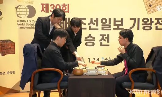 신민준 9단(왼쪽)이 제30회 LG배 결승에서 이치리키 료 9단을 시리즈 전적 2-1로 제압하고 우승했다. 국후 복기에는 신민준 9단의 스승 이세돌 9단(가운데)이 합류했다. 바둑TV 캡처 |