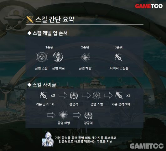 딜 사이클이 정말 간단하다. 힐러인지라 어려운 조작이 따로 필요 없다. 기본 공격을 하는 이유는 공명 회로 게이지를 채우기 위함이다. 기본 공격 3회면 공명 회로 게이지가 최대치까지 찬다. 공명 회로 게이지가 모두 차면 강공격을 하면 된다. 회로 게이지가 모두 채워지면 강공격을 한다는 점만 유의하면 된다.