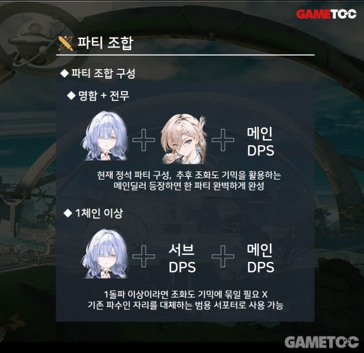 만약 린네도 없고 명함 상태라면 '모니에 + 서브 DPS + 메인 DPS'로 구성하면 된다. 이 경우 모든 버프가 파티에게 제공되지는 않는다. 울며 겨자 먹기로 사용하는 조합이다.
