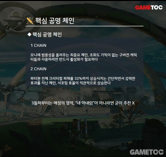공명 효율은 전투 기준 260% 이상이어야 한다. 그래야만 피해 증가 40%, 공명 해방으로 추가 버프도 최대 수치로 얻을 수 있다. 비전투 상태에서는 공명자 화면 기준 240%면 전투 도중 달성이 가능하다.