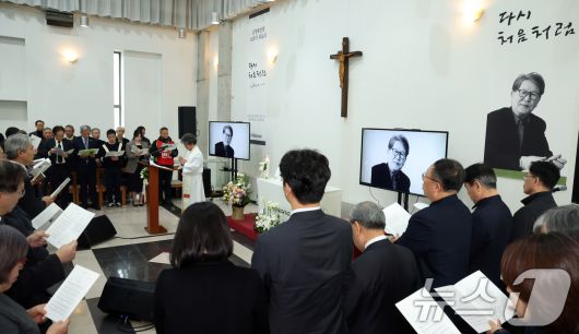 (서울=뉴스1) 김명섭 기자 = 15일 오후 서울 구로구 성공회대에서 열린 신영복 선생 10주기 추모식에서 참석자들이 성가를 부르며 추모하고 있다. 2026.1.15/뉴스1msiron@news1.krCopyright ⓒ 뉴스1. All rights reserved. 무단 전재 및 재배포, AI학습 이용 금지.