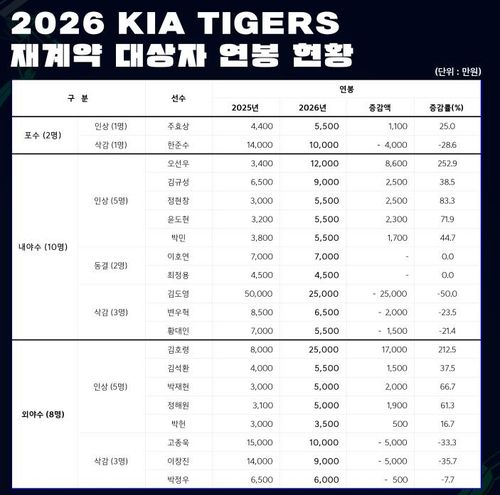 KIA 재계약 대상자 중 인상된 선수는 25명, 동결은 7명, 삭감은 16명이다.