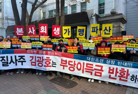 피자헛 가맹점주 94명이 지난 2024년 12월 10일 오전 10시 서울 서초동 서울회생법원 정문 앞에서 피자헛 본사를 상대로 차액가맹금 반환과 책임경영를 촉구하는 기자회견을 하고 있다./김채연 기자 |