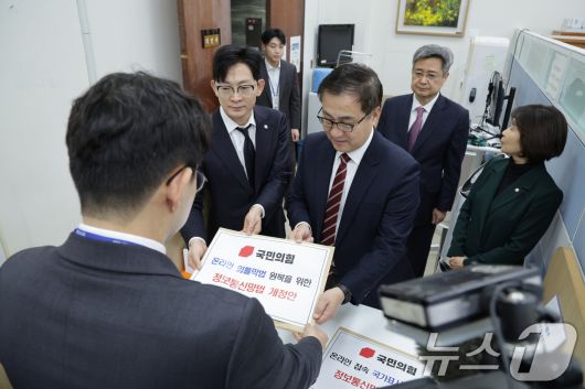 (서울=뉴스1) 신웅수 기자 = 최형두 의원을 비롯한 과학기술정보방송통신위원회 소속 국민의힘 의원들이 15일 서울 여의도 국회 의안과에 ‘온라인 접속 국가표시제 의무화 정보통신망법 개정안’과 ‘온라인 입틀막법 원복을 위한 정보통신망법 개정안’을 제출하고 있다. 2026.1.15/뉴스1