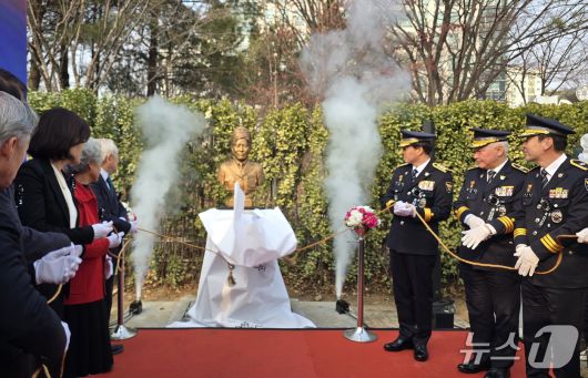 (인천=뉴스1) 이시명 기자 = 인천경찰청은 15일 청사 정문 추모비 앞에서 전창신 경감의 흉상 제막식을 개최했다.