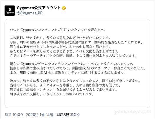 '우마무스메: 프리티 더비', '그랑블루 판타지' 등을 개발한 일본 사이게임즈가 AI 자회사 설립 발표 후 직면한 비판에 사과하고 생성형 AI를 활용한 이미지는 게임에 넣지 않겠다고 못 박았다.
