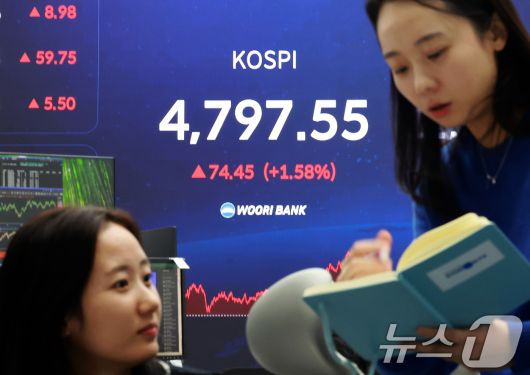 (서울=뉴스1) 이호윤 기자 = 코스피가 연일 사상 최고치를 경신한 15일 서울 중구 우리은행 본점 딜링룸 현황판에 종가가 표시되고 있다. 이날 코스피는 전 거래일 대비 74.45포인트(1.58%)상승한 4,797.55로 장을 마쳤다. 2026.1.15/뉴스1