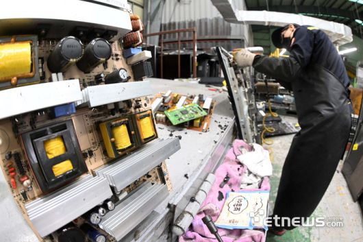 정부가 올해부터 폐가전 무상수거 대상과 범위를 대폭 확대한 가운데 전기·전자제품 재활용 현장이 분주해지고 있다. 15일 경기도 용인시 수도권자원순환센터에서 엔지니어가 폐가전으로 들어온 TV의 PCB기판 분해 작업을 하고 있다.