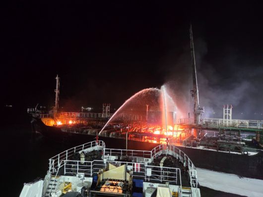 2025년 8월 여수해경 경비정이 여수 A정박지 선박 화재를 진압하고 있다. 여수해경 제공 |