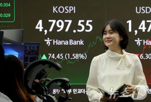 (서울=뉴스1) 이광호 기자 = 코스피가 10거래일 연속 상승하며 또다시 사상 최고치로 마감한 15일 오후 서울 중구 하나은행 딜룽룸 현황판에 전 거래일 대비 74.45포인트(1.58%) 상승한 4,797.55를 나타내고 있다. 2026.1.15/뉴스1skitsch@news1.krCopyright ⓒ 뉴스1. All rights reserved. 무단 전재 및 재배포, AI학습 이용 금지.