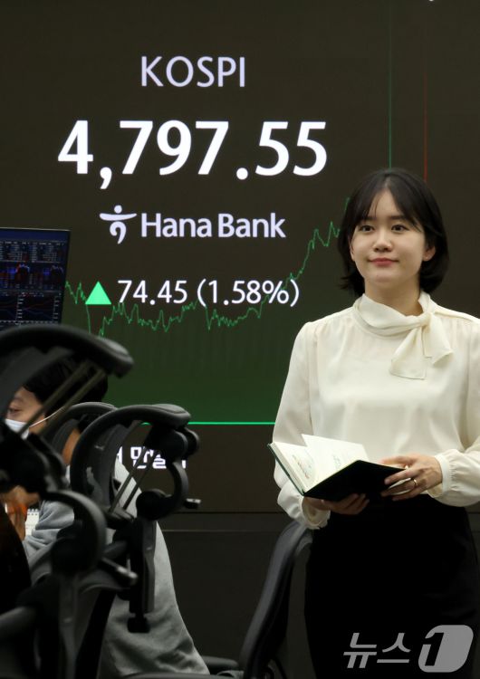 (서울=뉴스1) 이광호 기자 = 코스피가 10거래일 연속 상승하며 또다시 사상 최고치로 마감한 15일 오후 서울 중구 하나은행 딜룽룸 현황판에 전 거래일 대비 74.45포인트(1.58%) 상승한 4,797.55를 나타내고 있다. 2026.1.15/뉴스1