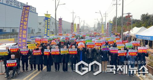 (김제=국제뉴스) 조광엽 기자 = 김제시의회(의장 서백현)와 새만금 미래 김제시민연대(위원장 강병진)가 15일, 새만금개발청 정문 앞에서 새만금신항의 기본계획 유지와 새만금개발청의 중립 행정을 강력히 촉구하는 대규모 규탄 결의대회를 공동 개최했다.