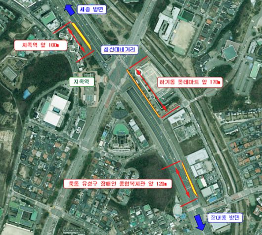 우선 시는 간선급행버스체계(BRT) 노선이 통과하며 교통량이 집중되는 유성구 침신대네거리 일원의 병목현상을 해결하기 위해 4억5000만 원을 투입해 지족역 앞 하기동 롯데마트 노은점 앞 죽동 유성구 장애인종합복지관 앞 등 총 3곳의 도로 확장 사업을 추진할 예정입니다.
