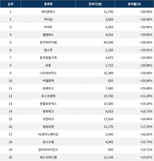 6위 윙스풋(335870)은 종가 2,150원으로 29.91% 상승 마감했다. 7위 한국정밀기계(101680)는 종가 3,975원으로 29.90% 상승 마감했다. 8위 포톤(208710)은 종가 2,715원으로 29.90% 상승 마감했다. 9위 나우로보틱스(459510)는 종가 31,300원으로 29.88% 상승 마감했다. 10위 비엘팜텍(065170)은 종가 635원으로 29.86% 상승 마감했다.