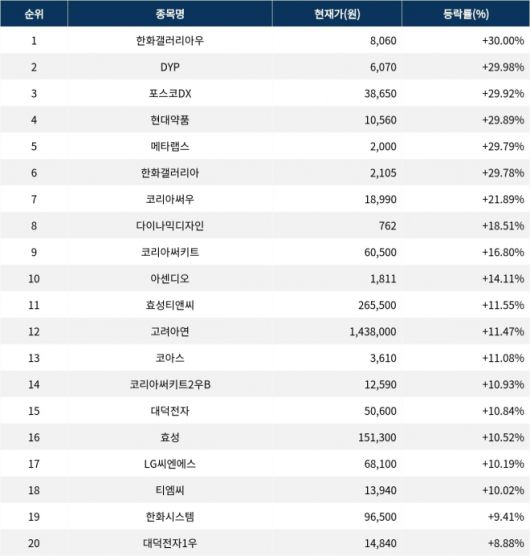 6위 한화갤러리아(452260)는 종가 2,105원으로 29.78% 상승 마감했다. 7위 코리아써우(007815)는 종가 18,990원으로 21.89% 상승 마감했다. 8위 다이나믹디자인(145210)은 종가 762원으로 18.51% 상승 마감했다. 9위 코리아써키트(007810)는 종가 60,500원으로 16.80% 상승 마감했다. 10위 아센디오(012170)는 종가 1,811원으로 14.11% 상승 마감했다.